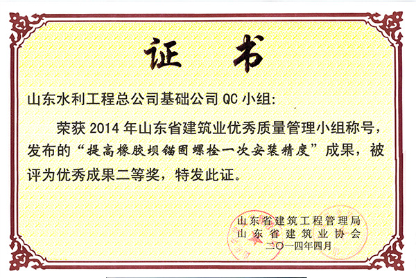 乐竞网页版“提高橡胶坝锚固螺栓一次安装精度”荣获2014年山东省建筑业优秀质量管理优秀成果二等奖