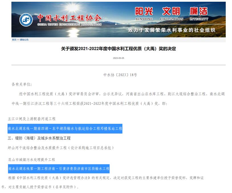 近日,中国水利工程协会发布《关于颁发2021-2022年度中国水利工程优质(大禹)奖的决定》,我乐竞网页版参建的南水北调东线第一期工程济南~引黄济青段济南市区段输水工程和南水北调东线一期南四湖~东平湖段输水与航运结合工程邓楼泵站工程荣获此项殊荣。